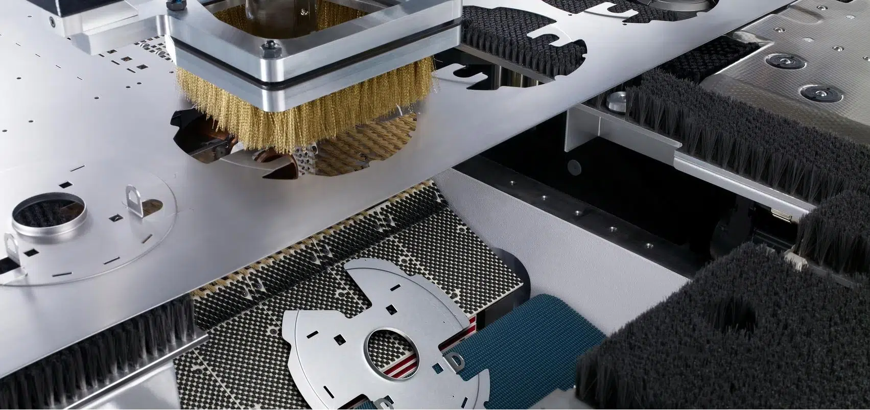 I vår helautomatiske Amada Vipros King stanselinje har vi stor kapasitet for store og små serier. I tillegg til konvensjonell stansing kan vi med høy presisjon lage forminger i detaljene slik som forsenkninger, luftespalter, styretapper, kulper osv. Med 30 tonns stansekraft og en verktøykarusell med 58 verktøystasjoner, og børstebord for ripefri produksjon er denne maskinen konstruert for høyt produksjonsvolum med høy grad av nøyaktighet.